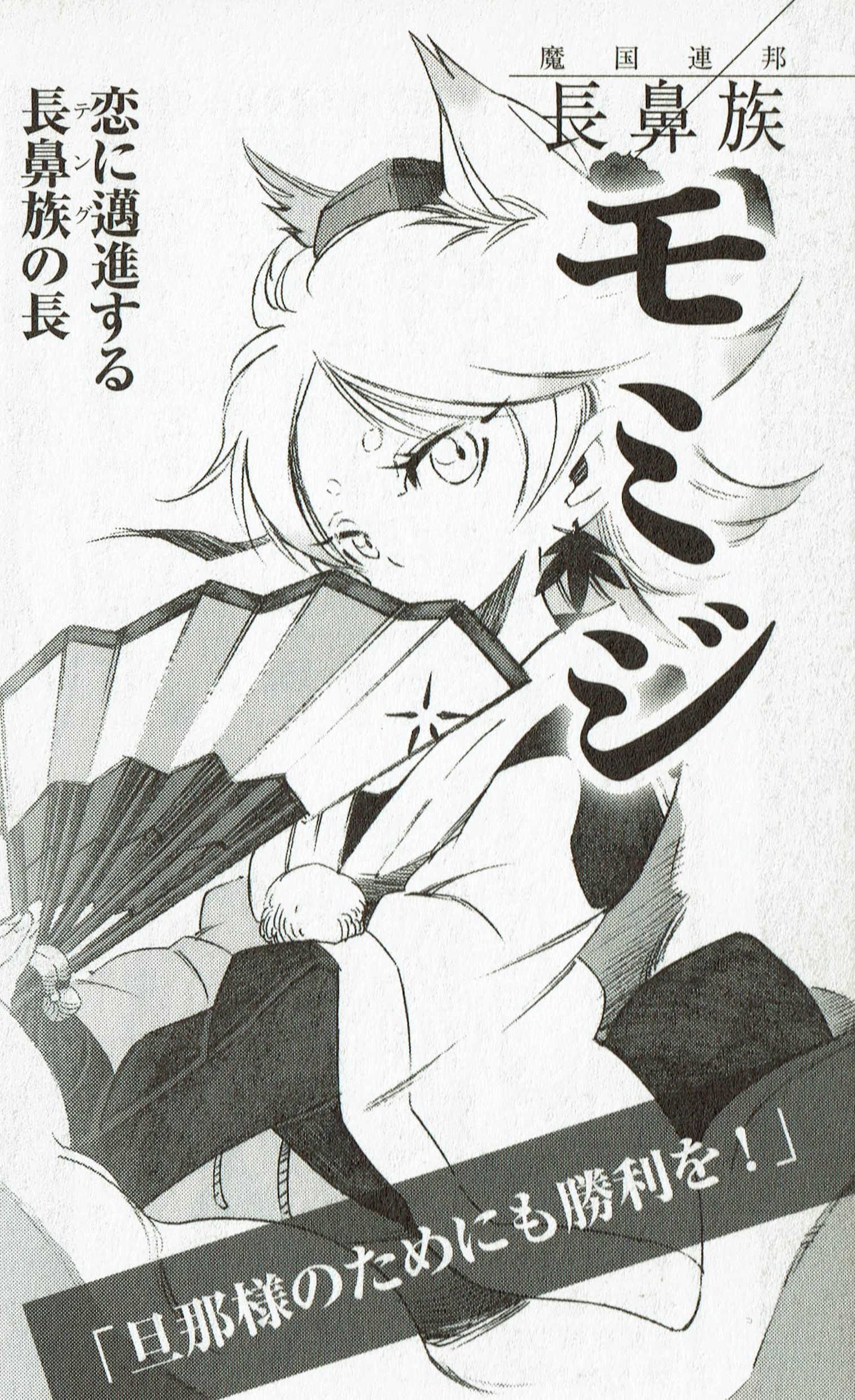 目が覚めるような美人で、テングの特徴の一つである大きな犬耳を持っている。